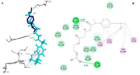 (A). Docked compound 5 (cyan) superimposed on the co-crystallized ibuprofen (blue) in the binding pocket of COX-1. (B) 2D diagram of compound 5 in the binding pocket of COX-1. Hydrogen bonds are shown as green dotted lines.