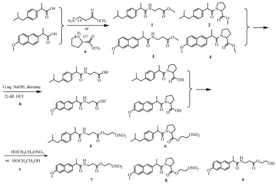 The methyl esters of beta-alanine and L-proline, as well as their amides with ibuprofen and naproxen (compounds 1–4) were prepared and characterized according to our previous report [20]. 2-Nitrooxy-ethanol was synthesized from ethane-1,2-diol, as described [10].