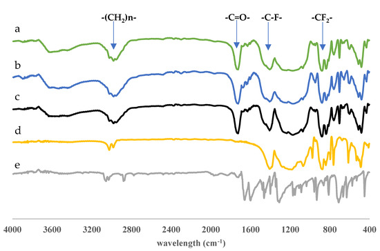 FTIR spectra of materials: (a) DIM after leaching, (b) DIM, (c) NIM, (d) PVDF membrane, and (e) anthrone template.