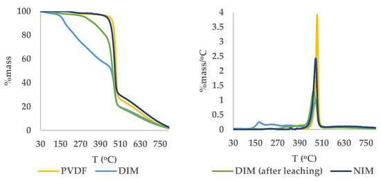 While FTIR spectroscopy provided valuable insights into the presence of functional groups within the composite materials, certain spectral regions exhibited potential overlap—particularly between the carbonyl group of anthrone and that of the cross-linker (ethylene glycol dimethacrylate), as well as between the aromatic C=C vibrations of anthrone and styrene (functional monomer). These overlaps may obscure definitive confirmation of complete template removal based solely on infrared analysis. Therefore, to complement the FTIR findings and provide further verification of anthrone elimination from the DIM matrix, thermal analysis using thermogravimetric analysis (TGA) and derivative thermogravimetry (DTG) was conducted. This approach allowed for the observation of characteristic thermal degradation patterns associated with the presence or absence of the template molecule.