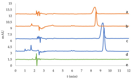 Overlay chromatograms of river water samples: (a) desorbed fluorene, (b) fluorene spiked sample before extraction and (c) desorbed phenanthrene, (d) phenanthrene spiked sample before extraction and (e) blank acetonitrile.