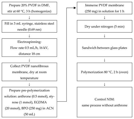 The immersion was carried out for 1 h at room temperature to ensure uniform infiltration of the pre-polymerization solution into the PVDF matrix. After soaking, the membrane was gently dried under a nitrogen gas stream for 5 min. It was then sandwiched between two glass plates to maintain its shape and structural integrity during polymerization. The polymerization process was conducted in an oven at 80 °C for 2 h. As a control, a NIM was synthesized using the same procedure but without the addition of the template molecule (anthrone). The overall preparation steps are illustrated in Figure 9.