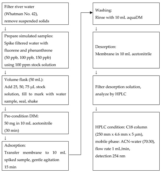 The analysis of fluorene and phenanthrene in these samples was carried out using a batch adsorption procedure. Prior to adsorption, 50 mg of the DIM was pre-conditioned by soaking in 10 mL of acetonitrile for 30 min to activate the surface and remove any loosely bound residues. Following pre-conditioning, the membrane was transferred into 10 mL of the spiked sample solution and allowed to adsorb the analytes under gentle agitation for 15 min at room temperature. After adsorption, the membrane was briefly rinsed with 10 mL of ultrapure water to eliminate non-specifically bound hydrophilic components. Subsequently, desorption of the retained analytes was performed by immersing the membrane in 10 mL of acetonitrile for 15 min, allowing the bound fluorene and phenanthrene to be effectively released into the solvent phase.