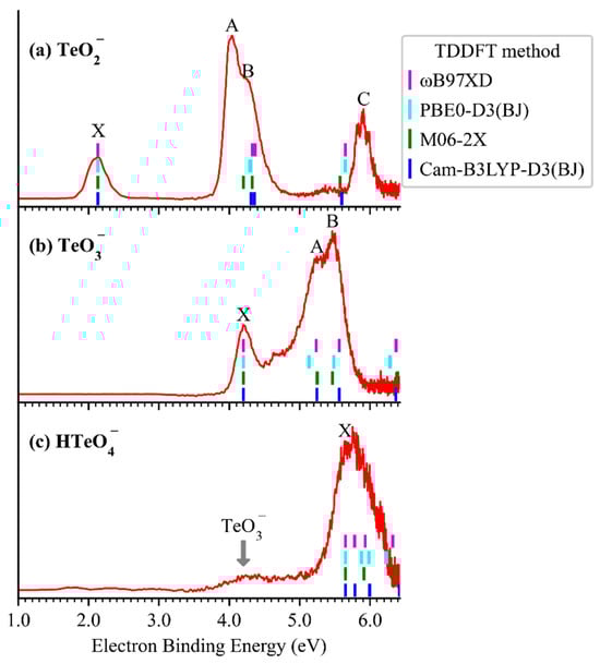 The 13K NIPE spectra (red traces) of TeO2− (a), TeO3− (b), and HTeO4− (c) at 193 nm. Short vertical bars denote the calculated excited-state energies of the neutrals based on various TDDFT methods with the aug-cc-pVTZ(-PP) basis set.