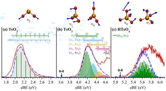 In the case of HTeO4− (Figure 4c), the X band arises from a complex coupling between the (227 cm−1) and (540 cm−1) modes, which involve both Te–O and H–O intricate stretching and bending vibrations. The simulated spectrum captures the vibrational fine structure near the rising edge of the X band, wherein the primary vibrational interval is mainly arising from the mode. The ADE extracted from the 0–0 transition is 5.11 eV, in excellent agreement with the calculated value using the ωB97XD functional, as shown in Table 1.