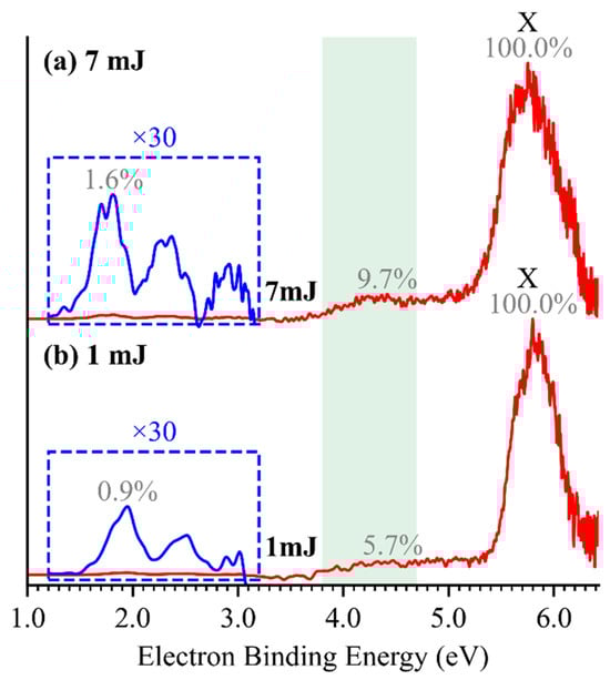 The photoelectron spectra of HTeO4− at 193 nm with pulse energies of 1 mJ (a) and 7 mJ (b).