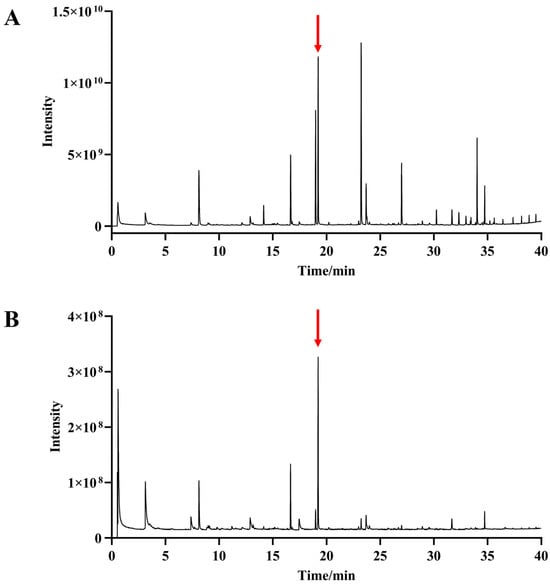 The TIC of Broccoli. (A), EI source. (B), CI source. The arrow in the figure indicates the IS, n-nonyl acetate.