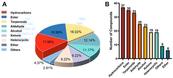 Hydrocarbons represented the most abundant class, with 37 compounds (17.96%), followed by esters (35 compounds, 16.99%), terpenoids (33 compounds, 16.02%), aldehydes (25 compounds, 12.14%), and alcohols (23 compounds, 11.17%). Ketones and heterocycles each accounted for 19 compounds (9.22%), while ethers were the least represented, with 6 compounds (2.91%). The remaining 4.37% were classified as “other compounds,” which included sulfur-containing compounds, peroxides, epoxides, phenols, and nitriles (Figure 2).