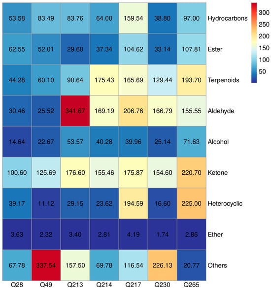 A total of nine compounds were classified as “other compounds,” including sulfur-containing compounds, peroxides, epoxides, and nitriles. Among these, two were not detected in any of the tested cultivars, and three were present in only one cultivar. Two compounds—decahydro-2,7a-dimethylnaphth[1,2-b]oxirene (an epoxide) and dimethyl trisulfide (a sulfur-containing compound)—were consistently detected across all seven cultivars. Dimethyl trisulfide was the most abundant compound in this category and the dominant sulfur-containing metabolite across all varieties, with the highest concentration observed in Q49 (337.38 μg/kg).