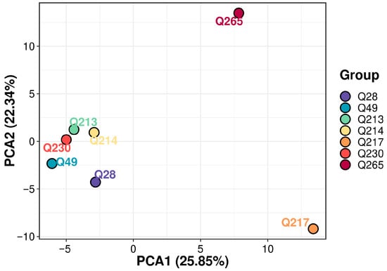 PCA was conducted to assess the variation and underlying patterns in the VOC profiles of the seven selected broccoli cultivars. The first two principal components, PC1 and PC2, accounted for 25.85% and 22.34% of the total variance, respectively (Figure 3). The PCA score plot (Figure 4) revealed clear separation of cultivars Q217 and Q265 from the remaining five varieties, indicating distinct differences in both the composition and relative abundance of VOCs. This separation highlights the unique volatile profiles of Q217 and Q265, which may be attributed to cultivar-specific metabolic traits or genetic background.