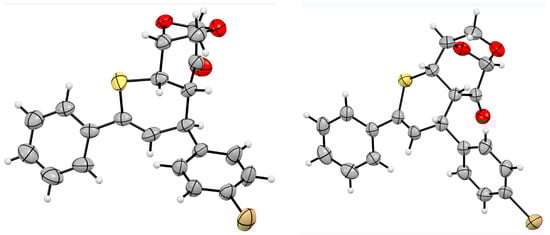 Molecular structures of the (4+2) cycloadducts (exo,exo)-3b (major, left) and (exo,endo)-3b (minor, right). Atoms are represented by thermal ellipsoids (50%). For graphics with atom labelling, see Figure S10a,b, respectively (Supplementary Materials).