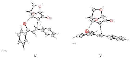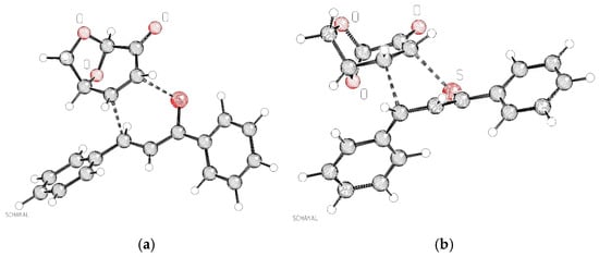 Out of curiosity, the respective transitions TS-(exo,exo)-4a and TS-(exo,endo)-4a are depicted in Figure 5. In contrast to the 3a-transition states they show shorter C⋯C distances compared to the S⋯C distances [(a) TS-(exo,exo)-4a, distance C⋯S: 2.424 Å, distance C⋯C: 2.259 Å; (b) TS-(exo,endo)-4a, distance C⋯S: 2.394 Å, distance C⋯C: 2.342 Å]. This can be interpreted as a preference for the bond formation to the β-carbon of enone 1, regardless of an attack by a carbon or by a sulfur center of 2a. The NBO charges of the relevant atoms for TS-(exo,exo)-4a (LGO part: O: −0.550 e−; C(O): 0.497 e−; C-α: −0.316 e−; C-β: −0.183 e−, thiochalkone part: S: 0.076 e−; C(S): −0.169 e−; C-α: −0.242 e−; C-β: −0.120 e−) differ significantly from those of TS-(exo,exo)-3a, being in sum by 0.106 e− more positive. Remarkably, in the hypothetical TS-(exo,exo)-4a, the difference in charges of the reacting atoms is quite different (C⋯S: 0.391 e− versus C⋯C: 0.062 e−) for the two forming bonds.