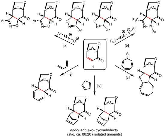 As shown in Scheme 1, efficient modifications of the LGO (1) skeleton can be achieved via various transformations of the reactive C=O and/or C=C bonds. In the current study, the α,β-unsaturated ketone moiety of 1 plays an important role in cycloadditions. A series of (3+2) cycloadditions (1,3-dipolar cycloadditions, Huisgen reactions) was successfully performed with 1 using nitrones [10,11], in situ-generated nitrile oxides [10], or nitrile imines [10,12] as 1,3-dipoles. Whereas reactions with a nitrile oxide and a C(Ph), N(Ph)-nitrile imine occurred with poor selectivity yielding mixtures of regio- and stereoisomeric isoxazole and pyrazole derivatives [10], (3+2) cycloadditions with fluorinated nitrile imines were highly stereoselective and exo-cycloadducts were formed as exclusive products without oxidation (and concomitant aromatization) of the initially formed 4,5-dihydropyrazole derivatives [12] (Scheme 1, [a] and [b]). The 1,3-dipolar cycloaddition of 1 with ethyl diazoacetate occurred with the formation of a single but unstable cycloadduct, which, under the reaction conditions, underwent further conversions initiated by dinitrogen elimination [13]. Notably, in a recent publication, a ‘higher order cycloaddition’ [(8+2) cycloaddition] of 1 with tropothione was also reported, and this reaction led to an exo-cycloadduct as a single product with complete stereoselectivity [14] (Scheme 1, [c]).