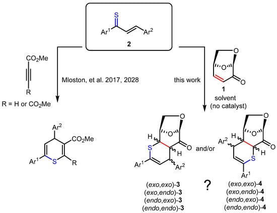 Hetero-Diels–Alder reactions of thiochalcones (2) with acetylenic dienophiles leading to functionalized thiopyrans [28,29] and the possible course of their reactions with levoglucosenone (1), providing stereoisomers of regioisomeric tricyclic products 3 or 4.