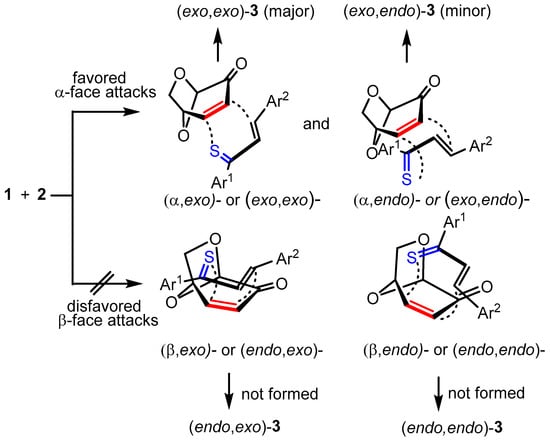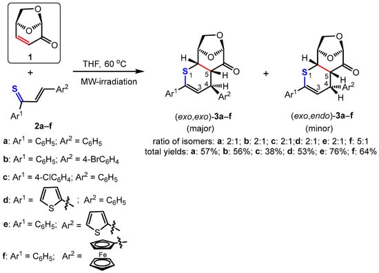 The obtained experimental results demonstrate that the exclusive reaction pathway via the favored attack of the less hindered α-face (exo-face) of 1 determines the structure of the finally formed (4+2) cycloadducts. The major products (exo,exo)-3 result from exo-attacks with respect to thiochalcones 2, and the minor products (exo,endo)-3 from endo-approaches, respectively.