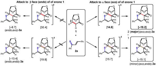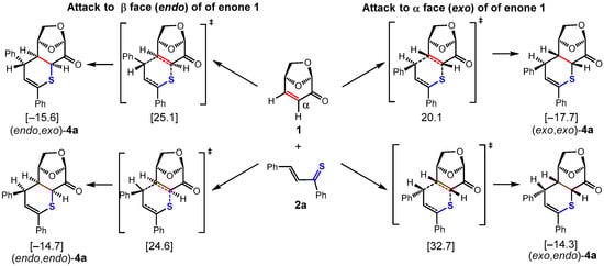Scheme 6 presents the results of attacks of the almost neutral S terminus of 2a to the β-carbon atom of enone 1 via the α-face (exo) and β-face (endo) (see Figure 1; compare refs. [28,29]). On the right-hand part of Scheme 6, the attacks to the exo-side of LGO (1) are given (O-bridge side, “from below”), on the left-hand part, the attacks to the endo-side (CH2-O-bridge side, “from above”) take place. In the upper line, the thiochalcone attacks with the β-C phenyl group in an exo-orientation, leading to (exo,exo)-3a or to (endo,exo)-3a. In the lower line of Scheme 6, this phenyl group is endo-positioned, giving (exo,endo)-3a and (endo,endo)-3a, respectively (see Scheme 5 for an alternative presentation).