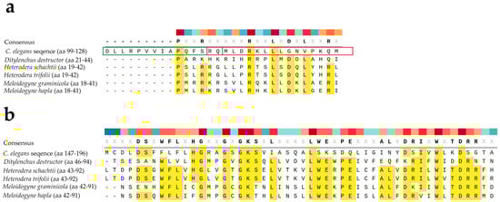 Multiple alignment between two sections (a,b) of CED4 from C. elegans (GenBank accession number C35D10.9a.1) and putative homologs from Ditylenchus destructor (GenBank accession number KAI1726433.1), Heterodera schachtii (GenBank accession number KAL3102088.1), Heterodera trifolii (GenBank accession number KAL3110170.1), M. graminicola (GenBank accession number KAF7640432.1), and M. hapla (GenBank accession number KAL7072841.1). Conserved amino acids (aa) are highlighted in yellow; other aa seem to be variable. In (a) the alignment is around the Peptide 2 (green box) and Peptide 3 (red box). The numbers in parenthesis next to the scientific names indicate the corresponding amino acids (aa) in the protein. Multiple alignment and visualization were conducted using SnapGene software (www.snapgene.com).