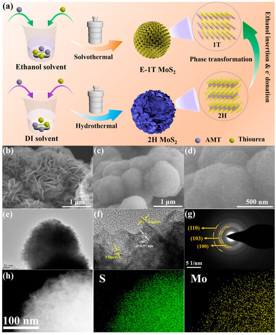 The synthesis processes of E-1T MoS2 and 2H MoS2 samples are schematically illustrated in Figure 1a. First, the ammonium molybdate (AMT) and thiourea were mixed into the deionized (DI) water via magnetic stirring, and then underwent a typical hydrothermal process to obtain a pristine 2H MoS2 sample with an irregular nanoflower-like structure. When the DI water solvent was replaced by the ethanol solvent, the similar solvothermal process was performed to achieve an extraordinary E-1T MoS2 sample with a regular sphere-like interlaced nanosheets structure. The transformation mechanism from 2H to 1T phase could be attributed to the ethanol molecules intercalating into the interlayer of MoS2 grain in the solvothermal process, and its -OH functional group serving as an electron donor to induce the formation of 1T phase with expanded interlayer spacing, which could be universal for the general alcohol-based small molecules [32,35]. Moreover, the low-boiling point ethanol molecule did not remain in the interlayer, which is beneficial to full delivery of high sodium storage capacity discussed below. Meanwhile, the rich -OH functional groups brought by the ethanol molecules could also act as nucleation sites to confine the growth of MoS2 nanosheets and prevent their irregular stack, forming the regular nanosphere-like structure assembled by ultrasmall nanosheetsFigure 1b and Figure S1 clearly show the different magnification SEM images of the 2H MoS2 sample exhibiting the nanoflower-like morphology with a diameter of about 1–2 μm, composed of many irregularly aggregated nanosheets with length sizes of around 400–500 nm. As shown in Figure 1c,d, the E-1T MoS2 sample presents the smaller micron-sized nanosphere-like shape due to the smaller nanosheet unit with a lateral size of about 50–100 nm. Figure 1e also exhibits the TEM image of E-1T MoS2 sample, further demonstrating a sphere-like morphology consisting of many regularly interwoven nanosheets with lateral sizes of around 50 nm and thicknesses of about 2–3 nm. The HRTEM image of E-1T MoS2 sample (Figure 1f) displays the few-layer nanosheet character, with about three layers, accompanied by a larger interlayer spacing of around 0.97 nm. As shown in the in-plane HRTEM image of the E-1T MoS2 sample (Figure S2), there exists hexagonal and trigonal lattice areas representing 2H and 1T phase structure characteristics, respectively, suggesting the co-existence of 1T and 2H phases in the E-1T MoS2 sample. Meanwhile, the 2H MoS2 sample exhibits the thicker multi-layer nanosheet structure with smaller interlayer spacing of about 0.67 nm (Figure S3), proving the intercalation and electron transfer of the ethanol molecule induced the formation of 1T phase with the larger interlayer spacing, which is beneficial to Na+ transport kinetics as discussed below. Figure 1g and Figure S4 show the selected area electron diffraction (SAED) patterns of the E-1T MoS2 and 2H MoS2 samples, respectively, all exhibiting the concentric ring characteristic of polycrystalline structures. Compared to the obvious concentric rings in 2H MoS2 sample (Figure S4), the SAED pattern of E-1T MoS2 became weaker and its (002) diffraction ring almost disappeared, indicating the significantly reduced nanosheet size and few-layer nanosheet structure, which is also consistent with the XRD and TEM results. The EDS mapping images display the homogeneous distribution of Mo and S elements, indicating the reliable MoS2 structure.