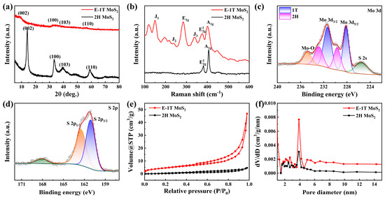 (a) XRD patterns and (b) Raman spectra of E-1T MoS2 and 2H MoS2 samples. High-resolution XPS spectra of (c) Mo 3d and (d) S2p of E-1T MoS2 sample. (e) Isothermal N2 adsorption/desorption curves and (f) pore size distributions of E-1T MoS2 and 2H MoS2 samples.