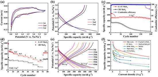 Initial three cycles of (a) CV curves at 0.1 mV s−1 and (b) GCD profiles at 0.1 A g−1 of E-1T MoS2 electrode. (c) Cycling performance of E-1T MoS2 and 2H MoS2 electrodes at 1 A g−1. (d) Rate performance of E-1T MoS2 and 2H MoS2 electrodes. (e) GCD profiles of E-1T MoS2 electrode at the various current densities. (f) Rate capability comparison of E-1T MoS2 electrode with the other reported MoS2-based electrodes for SIBs.
