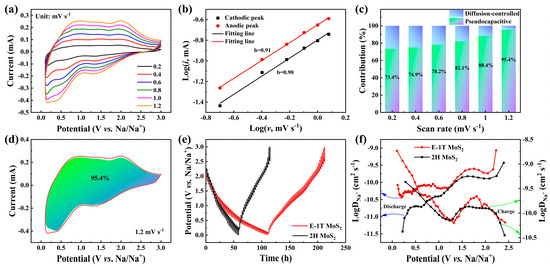 (a) CV curves of E-1T MoS2 electrode at the different scan rates. (b) The calculated b values for E-1T MoS2 electrode via Log(i)-Log(v) relationship. (c) Pseudocapacitive contribution ratios of E-1T MoS2 electrode at the various scan rates. (d) The fitting of pseudocapacitive contribution ratio at 1.2 mV s−1. (e) GITT curves and (f) Na+ diffusion coefficients during the discharging and charging processes of E-1T MoS2 and 2H MoS2 electrodes.