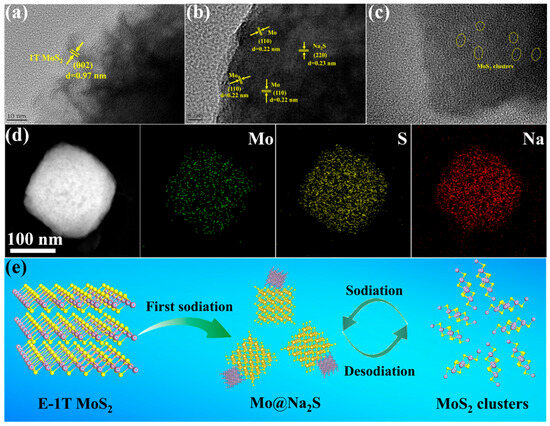 Ex-situ TEM images at (a) OCV, (b) fully sodiation and (c) fully desodiation states for E-1T MoS2 electrode. (d) ex-situ EDS mapping images of E-1T MoS2 electrode at fully sodiation state. (e) The schematic diagram of sodium reaction mechanism of E-1T MoS2 electrode.