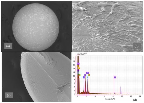 SEM and EDX analysis of thiourea-functionalized resin TD301: (a) Bead morphology; (b) Functionalized surface; (c) EDX region; (d) EDX spectrum.
