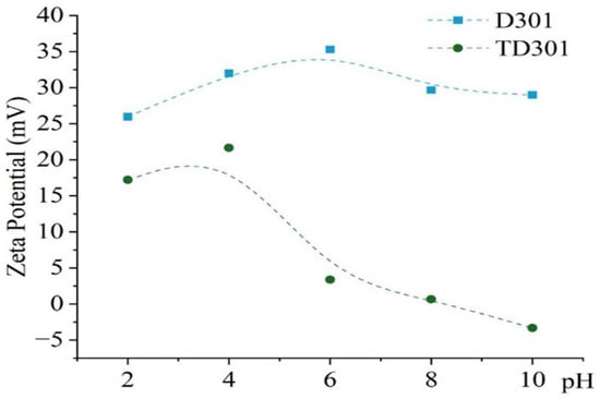 Zeta potential of modified (TD301) and unmodified (D301) sorbents.