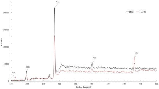 A survey XPS analysis was performed to enhance the reliability of the surface modification, which was confirmed accurately, and this analysis allowed for the assessment of changes in the surface elemental composition of the sorbents resulting from the modification. Figure 5 presents a comparison of the spectrum of the unmodified sorbent D301 and the modified sorbent TD301. Since the samples analyzed are non-conductive, peak shifts caused by surface charging were observed. To obtain accurate data, we adjusted the measurements by using the carbon peak as a reference, shifting the spectrum by −1.3 eV on the energy scale.
