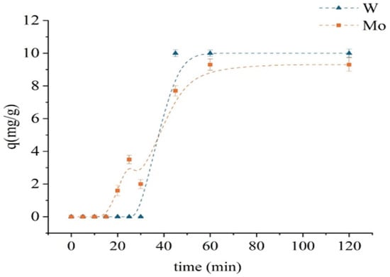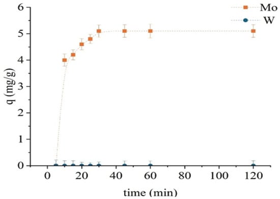 Figure 6 presents the kinetics of Mo and W sorption on the unmodified D301 resin. The experiments were carried out with initial concentrations of 100 mg/L for both [Mo6+] and [W6+], at a solid-to-liquid ratio of 1:100 temperature of 298 K, and a stirring speed of 320 rpm. During the first 20 min, no significant uptake of either molybdenum or tungsten was observed. The sorption of molybdenum gradually increased—from 1.6 mg/g at 20 min to 9.3 mg/g at 60 min—after which it reached saturation. In contrast, tungsten sorption remained low during the first 30 min and then increased sharply, reaching 10 mg/g by the 45th minute and subsequently stabilizing. Such behavior indicates a delay in the initial stage of sorption, which may be attributed to diffusion limitations or the necessity of activation of ion-exchange sites. Equilibrium was attained within 60 min for both metals, and this contact time was selected for subsequent batch experiments. The faster sorption of tungsten is consistent with the high electronegative affinity of the resin for anionic species.