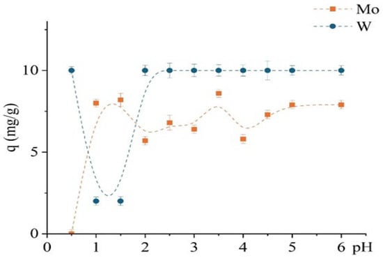 The study investigated the effect of pH (0.5–6) on the sorption performance of the unmodified D301 resin toward Mo(VI) and W(VI), as shown in Figure 7, revealing distinct differences in their uptake behavior. Experimental conditions were similar to those used in the previous kinetic study, with an optimized contact time of 1 h. Molybdenum exhibited a strong pH dependence: sorption increased sharply from pH 1 to 2 and reached a maximum at approximately pH 3.5 (~8.6 mg/g), followed by a slight decline. In contrast, the sorption of W(VI) was almost independent of pH: complete uptake (10 mg/g) was observed even at pH 0.5 and remained constant up to pH 6.