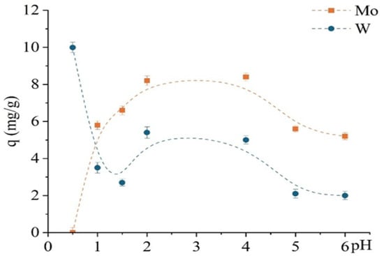 Nevertheless, the separation of Mo and W remains a challenging task due to their chemical similarities and analogous behavior in solution. In neutral and mildly alkaline conditions (pH 6–9), Mo and W predominantly exist as MoO42− and WO42− oxoanions or as polymetallic species such as Mo7O246− and W7O246− [1,2,3,22]. As the pH decreases, molybdenum and tungsten exist primarily as protonated species (e.g., HMoO4−, HWO4−) and hydrated oxoacids (H2MoO4, H2WO4). Under strongly acidic conditions (pH < 2), these metals tend to form large polyoxometalates such as Mo8O264− and W12O408− [28,30,31]. At pH < 0.5, molybdenum exists predominantly in cationic form, while tungsten is present as tungstic acid. These changes in the chemical forms of the metals affect their electrical charge and arrangement, making it harder for them to interact specifically with the functional groups of sorbents.