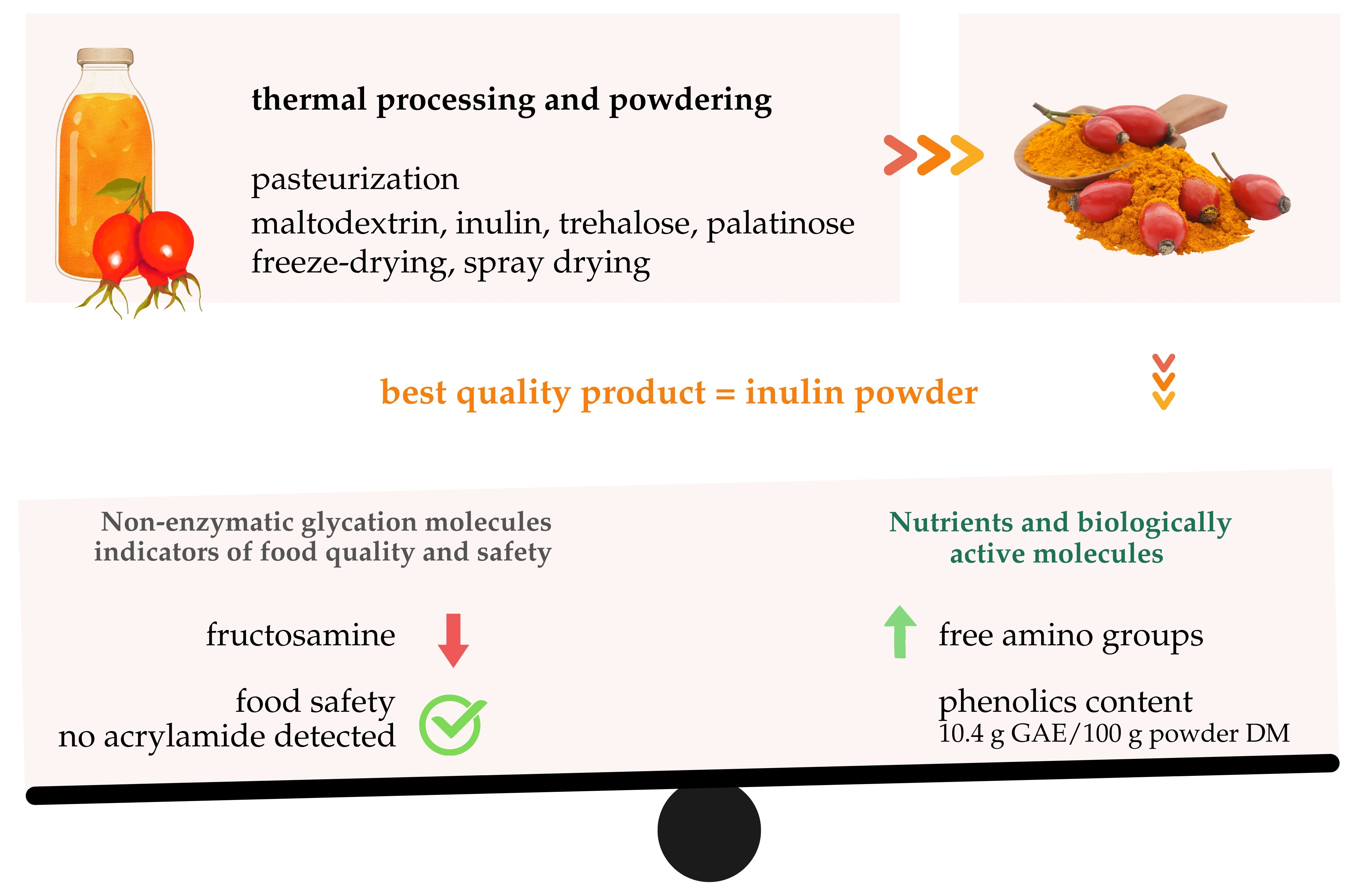 - Hendrysiak, A.; Brzezowska, J.; Nicolet, N.; Bocquel, D.; Andlauer, W.; Michalska-Ciechanowska, A. Juice Powders from Rosehip (Rosa canina L.): Physical, Chemical, and Antiglycation Properties. Molecules 2023, 28, 1674. [Google Scholar] [CrossRef] [PubMed]
