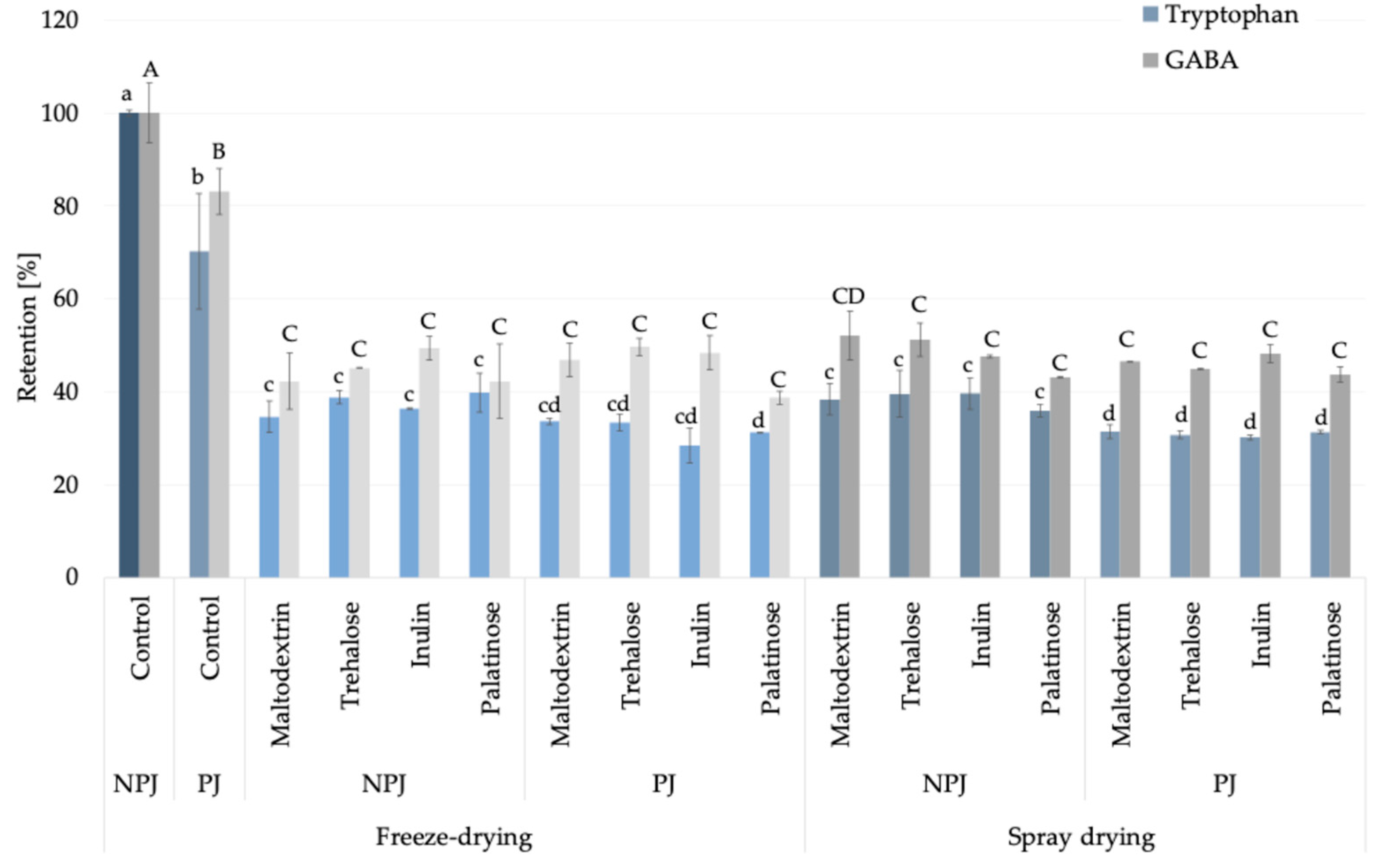 | Pasteurized juice | Maltodextrin | 2.84 ± 0.01 a | 2.72 ± 0.01 b–d | <LOD | 0.15 ± 0.02 a |