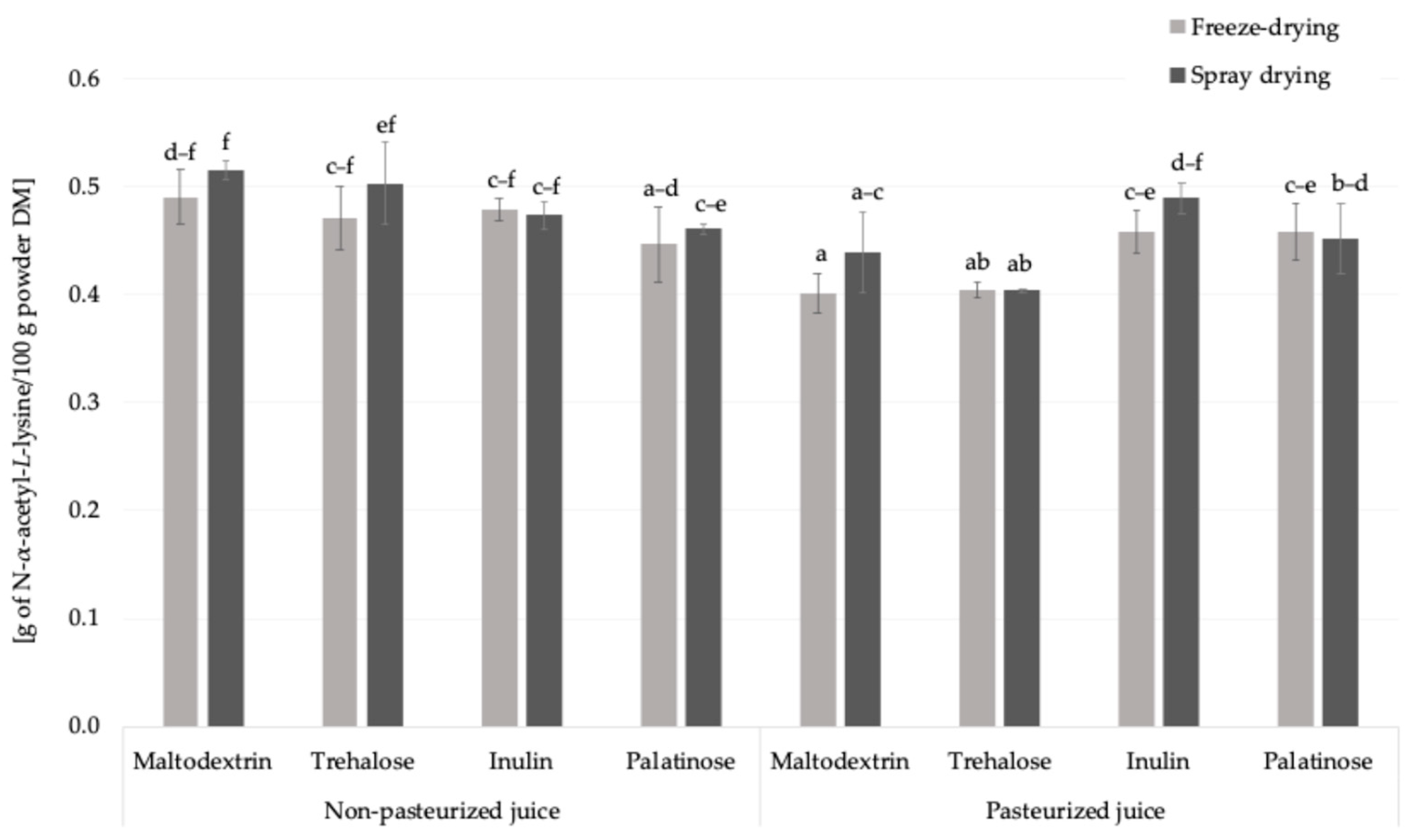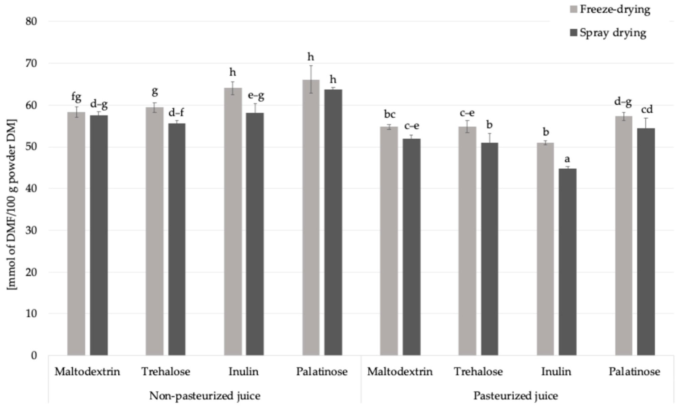 | Non-pasteurized juice | Maltodextrin | 2.96 ± 0.02 a | 2.88 ± 0.01 d–f | <LOD | 0.23 ± 0.03 b |
