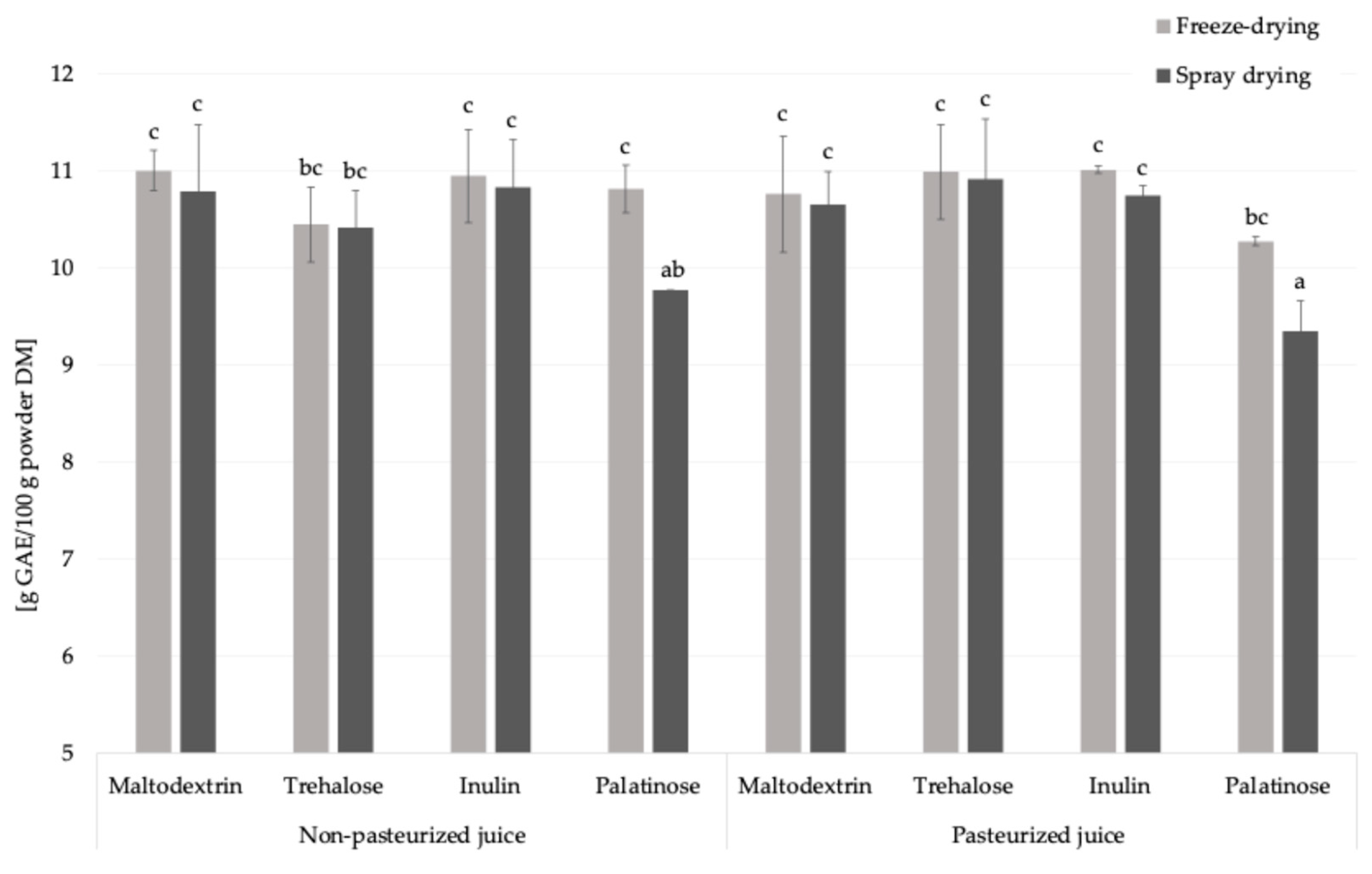 | Pasteurized juice | Maltodextrin | 2.78 ± 0.06 a | 2.63 ± 0.19 bc | <LOD | 0.23 ± 0 b |