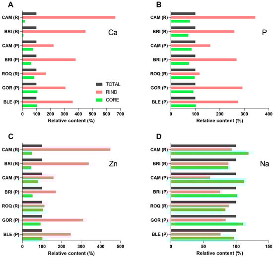 2.2. Spatial Distribution of Minerals in White Mold-Ripened and Blue-Veined Cheeses