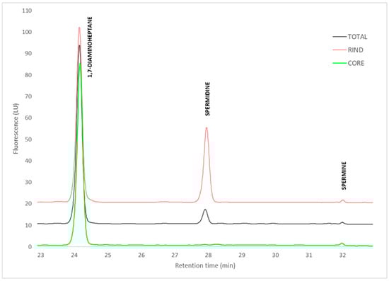 - Esatbeyoglu, T.; Ehmer, A.; Chaize, D.; Rimbach, G. Quantitative Determination of Spermidine in 50 German Cheese Samples on a Core-Shell Column by High-Performance Liquid Chromatography with a Photodiode Array Detector Using a Fully Validated Method. J. Agric. Food Chem. 2016, 64, 2105–2111. [Google Scholar] [CrossRef]