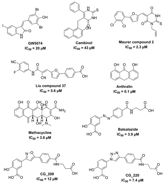 (S)-5-(4-(4-((1-Carboxy-3-cyanopropan-2-yl)carbamoyl)phenyl)-1H-1,2,3-triazol-1-yl)-2-hydroxybenzoic acid (50). Prepared according to General Procedure E from triazole 41 (120 mg, 0.212 mmol) and 0.70 M aq. KOH solution (59.5 mg, 1.06 mmol). The reaction mixture was stirred at room temperature for 30 min. The crude product was resuspended in EtOAc (10 mL), filtered and the solid residue collected to give cyanomethyl 50 (53.7 mg, 0.123 mmol, 58%) as a white solid. m.p.: 292 °C. 1H-NMR (400 MHz, (CD3)2SO): δ (ppm) = 12.44 (s, 1H, 1-COOH or 1′-COOH), 9.42 (s, 1H, 5′-H), 8.74 (d, J = 7.7 Hz, 1H, CONH), 8.30 (d, J = 2.8 Hz, 1H, 6-H), 8.11–8.08 (m, 1H, 4-H), 8.10–8.03 (m, 2H, 2″-H and 6″-H), 8.01–7.94 (m, 2H, 3″-H and 5″-H), 7.22 (d, J = 8.9 Hz, 1H, 3-H), 4.58–4.48 (m, 1H, 2′′′′-H), 2.97–2.81 (m, 2H, 3′′′-H), 2.77–2.61 (m, 2H, 1′′′-H). 13C-NMR (101 MHz, (CD3)2SO): δ (ppm) = 171.58 (1′′′-COOH), 170.85 (1-COOH), 165.60 (CONH), 160.91 (C-2), 146.40 (C-4′), 133.31 (C-4″), 133.19 (C-1″), 128.50 (C-5), 128.13 (C-3″ and C-5″), 127.40 (C-4), 125.01 (C-2″ and C-6″), 121.67 (C-6), 120.62 (C-5′), 118.69 (C-3), 118.42 (CN), 113.99 (C-1), 43.55 (C-2′′′), 37.71 (C-3′′′), 22.36 (C-1′′′). IR (ATR): ṽ (cm−1) = 3364, 3116, 1716, 1675, 1546, 1292, 1194, 1045, 828, 768, 691. HR-MS (ESI): m/z = [M − H]− calcd for C21H16N5O6−: 434.1101; found: 434.1102. Specific rotation: [α +12 (c 0.1 in DMSO). Purity (HPLC): 210 nm: >95%; 254 nm: >95%.