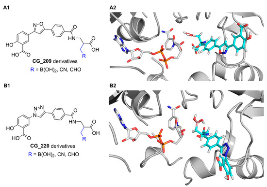 (R)-2-(6-(4-(3-(2,2-Dimethyl-4-oxo-4H-benzo[d][1,3]dioxin-6-yl)isoxazol-5-yl)phenyl)-2-hydroxy-3,4-dihydro-2H-1,5,2-oxazaborinin-4-yl)acetic acid (51). Prepared according to General Procedure E from isoxazole 36 (30.0 mg, 0.0590 mmol) and 0.40 M aq. KOH solution (4.97 mg, 0.0885 mmol). The reaction mixture was stirred at 0 °C for 30 min. The crude product was resuspended in DCM (10 mL), filtered and the solid residue collected to give cyclic boronic acid 51 (15.1 mg, 0.0317 mmol, 54%) as an off-white solid. m.p.: 233 °C. 1H-NMR at 90 °C (400 MHz, (CD3)2SO): δ (ppm) = 8.41–8.37 (m, 1H, 5′′′′-H), 8.25–8.19 (m, 1H, 7′′′′-H), 8.09–7.97 (m, 4H, 2″-H, 3″-H, 5″-H and 6″-H), 7.77–7.68 (m, 1H, 4′′′-H), 7.29 (d, J = 8.6 Hz, 1H, 8′′′′-H), 4.27–4.10 (m, 1H, 4′-H), 3.78–3.53 (m, 2H, 2-H or 3′-H), 2.69–2.54 (m, 2H, 2-H or 3′-H), 1.76 (s, 6H, (CH3)2). 13C-NMR (126 MHz, (CD3)2SO): δ (ppm) = 172.68 (C-1), 169.16 (C-5′′′), 166.79 (C-6′), 161.45 (C-3′′′), 159.75 (C-4′′′′), 156.81 (C-8a′′′′), 134.79 (C-1″ and C-7′′′′), 128.75 (C-4″), 128.37 (C-2″ and C-6″ or C-3″ and C-5″), 127.36 (C-5′′′′), 125.87–125.51 (C-2″ and C-6″ or C-3″ and C-5″), 123.23 (C-6′′′′), 118.56 (C-8′′′′), 113.56 (C-4a′′′′), 107.02 (C-2′′′′), 99.66 (C-4′′′), 64.03 (C-2 or C-3′), 48.18 (C-4′), 25.33 ((CH3)2). IR (ATR): ṽ (cm−1) = 3122, 2995, 1736, 1619, 1287, 1199, 1016, 927, 763, 674. HR-MS (ESI): m/z = [M + H]+ calcd for C24H22BN2O8+: 477.1469; found: 477.1427. Specific rotation: [α −6 (c 0.1 in DMSO). Purity (HPLC): 210 nm: 94%; 254 nm: >95%.