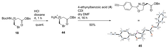 Benzyl (S)-2-(2-(4-ethynylphenyl)-4,5-dihydrooxazol-4-yl)acetate (45). Prepared according to General Procedure B from aminium 44 (459 mg, 1.68 mmol) and 4-ethynylbenzoic acid (284 mg, 1.85 mmol). The reaction mixture was stirred at room temperature for 16 h. The crude product was purified by FCC (hexanes/EtOAc 75:25) to give oxazoline 45 (269 mg, 0.842 mmol, 50%) as a yellow solid. m.p.: 82 °C. 1H-NMR (400 MHz, (CD3)2SO): δ (ppm) = 7.86–7.82 (m, 2H, 2″-H and 6″-H), 7.60–7.55 (m, 2H, 3″-H and 5″-H), 7.39–7.28 (m, 5H, 2′′′-H, 3′′′-H, 4′′′-H, 5′′′-H and 6′′′-H), 5.13 (d, J = 2.0 Hz, 2H, 1′′′-CH2), 4.63–4.55 (m, 2H, 4′-H and 5′-H), 4.41 (s, 1H, C≡CH), 4.20–4.11 (m, 1H, 5′-H), 2.78–2.73 (m, 2H, 2-H). 13C-NMR (101 MHz, (CD3)2SO): δ (ppm) = 170.65 (C-1), 162.29 (C-2′), 136.08 (C-1′′′), 131.94 (C-3″ and C-5″), 128.40–127.97 (C-2′′′, C-3′′′, C-4′′′, C-5′′′ and C-6′′′), 127.84 (C-2″ and C-6″), 127.41 (C-1″), 124.73 (C-4″), 83.24 (C≡CH or C≡CH), 82.80 (C≡CH or C≡CH), 72.12 (C-5′), 65.53 (1′′′-CH2), 62.91 (C-4′), 39.50 (C-2). IR (ATR): ṽ (cm−1) = 3212, 2812, 2590, 1719, 1710, 1645, 1500, 1348, 1227, 1167, 1082, 954, 739, 697, 679. HR-MS (ESI): m/z = [M + H]+ calcd for C20H18NO3+: 320.1287; found: 320.1280. Specific rotation: [α −42 (c 0.1 in DMSO).