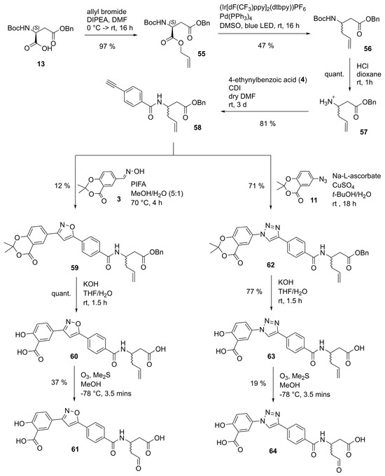 5-(4-(4-((1-Carboxy-4-oxobutan-2-yl)carbamoyl)phenyl)-1H-1,2,3-triazol-1-yl)-2-hydroxybenzoic acid (64). A solution of vinyl 63 (100 mg, 0.229 mmol) in 8 mL MeOH was flushed with N2 and cooled to −78 °C. O3 (flowrate: 25–30, power: 35%) was then bubbled into the solution for 3.5 min. Me2S (25.5 µL, 0.344 mmol) was added and the solution stirred at room temperature for 1 h. The solvent was removed in vacuo and the crude product purified by PTLC (DCM/MeOH 85:15 + 1% AcOH) to give aldehyde 64 (18.9 mg, 0.0431 mmol, 19%) as a beige solid. m.p.: 151 °C (decomposition). 1H-NMR (500 MHz, (CD3)2SO): δ (ppm) = 9.69 (s, 1H, 4′′′-H), 9.65 (s, 1H, CONH), 9.27 (s, 1H, 5′-H), 8.13 (d, J = 2.9 Hz, 1H, 6-H), 8.06–8.01 (m, 2H, 2′′-H and 6″-H), 7.89–7.85 (m, 2H, 3″-H and 5″-H), 7.69 (dd, J = 8.7, 2.9 Hz, 1H, 4-H), 6.82 (d, J = 8.7 Hz, 1H, 3-H), 4.61–4.55 (m, 1H, 2′′′-H), 2.76–2.55 (m, 2H, 3′′′-H), 2.30–2.20 (m, 2H, 1′′′-H). 13C-NMR (126 MHz, (CD3)2SO): δ (ppm) = 202.17 (C-4′′′), 174.34 (1′′′-COOH), 170.08 (1-COOH), 164.53 (CONH), 164.03 (C-2), 146.09 (C-4′), 133.81 (C-4″), 133.18 (C-1″), 127.57 (C-3″ and C-5″), 125.87 (C-5), 125.00 (C-2″ and C-6″), 123.76 (C-4), 121.70 (C-6), 120.71 (C-1), 120.23 (C-5′), 117.03 (C-3), 49.01 (C-3′′′), 43.08 (C-2′′′), 41.44 (C-1′′′). IR (ATR): ṽ (cm−1) = 3300, 2918, 1716, 1636, 1576, 1487, 1374, 1252, 1043, 829, 769, 706. HR-MS (ESI): m/z = [M-H]− calcd for C21H17N4O7−: 437.1097; found: 437.1102. Purity (HPLC): 210 nm: 94%; 254 nm: 92%.