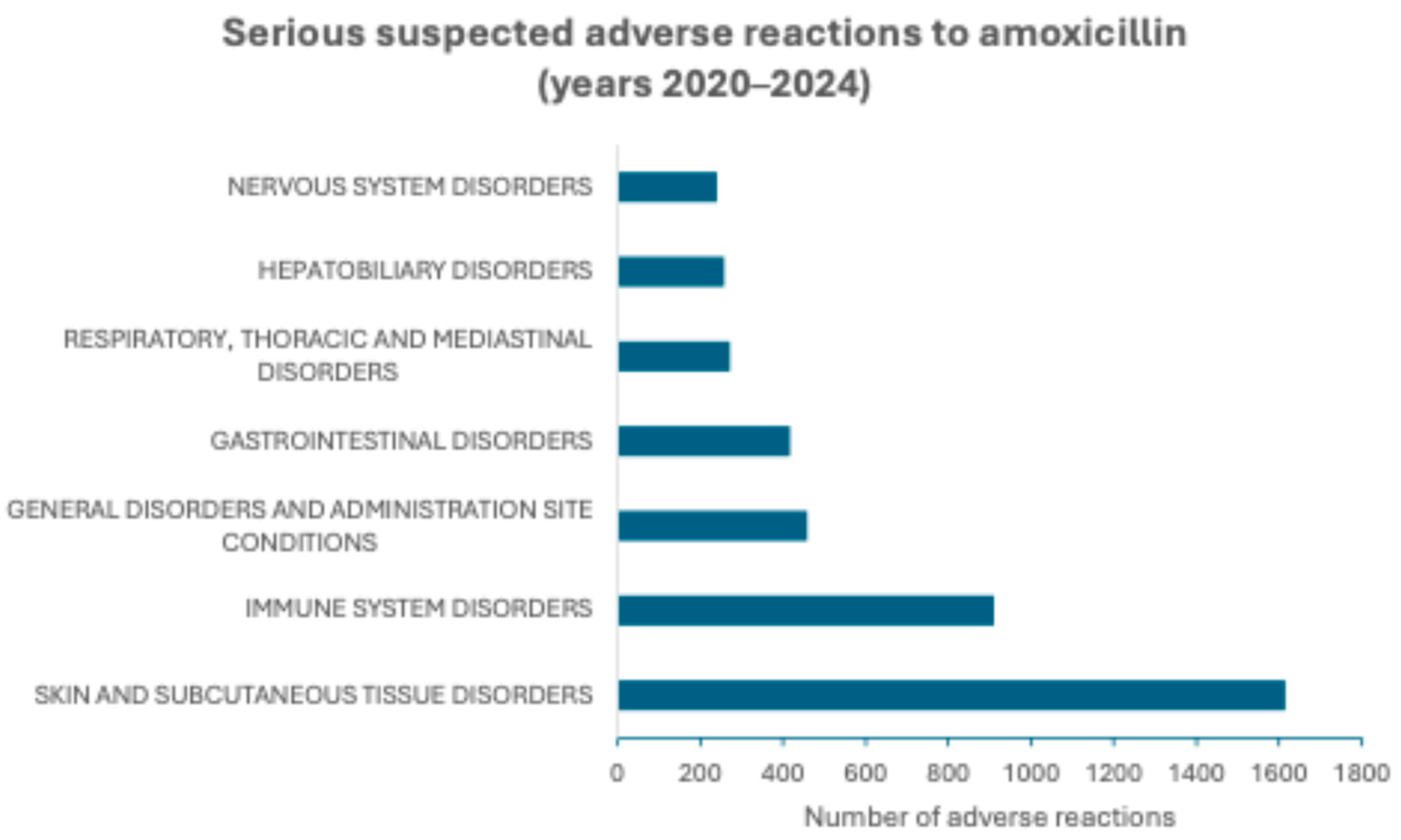 2.2. Serious Suspected Adverse Reactions to Amoxicillin/Clavulanic Acid and Amoxicillin According to the System Organ Class (SOC) Level