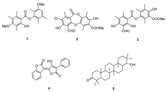 Aromatic organic compounds, both of natural and synthetic origin, appear as good alternatives to overcome this problem because they show photoprotective and antioxidant properties as result of absorbing photons emitted by UVR and stabilizing free radicals [10,13]. In the search for these compounds, lichens are an original source of bioactive molecules with these characteristics. Lichens are symbiotic organisms formed by a photobiont (algae or/and cyanobacteria) and a mycobiont. They biosynthesize secondary metabolites that are classified according to their biosynthetic pathways as follows: monocyclic phenols; depsides; depsidones; depsones; debenzofurans; xanthones; naphtoquinones and anthraquinones (polyketide pathway); steroids and carotenoids (mevalonic acid pathway); as well as amino acid derivatives and cyclopeptides (shikimic acid pathway) [14,15]. Many of these metabolites have great potential as bioactive molecules showing a broad range of biological activities, among which anticancer and antimicrobial activities stand out [8,16,17,18].