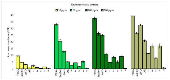 Controls as well as lichen metabolites 1 to 4 and AE showed a concentration dependence on their SPF (p < 0.05), reaching their highest values at 200 ppm (Figure 2). PBSA evidenced its “high” UVB photoprotective capacity at 50 ppm (SPF 30 to 50) (p < 0.05). In turn, AVO and Eu4360 showed lower SPF values than PBSA along the studied concentration range according to their UVA and UVA-UVB properties, respectively.
