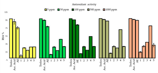 The antioxidant potential of compounds 1 to 5 and AE was evaluated through DPPH (2,2-diphenyl-1-picrylhydrazyl) radical scavenging activity. Trolox and ascorbic acid were used as controls (Figure 3).