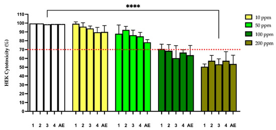 Cytotoxicity of compounds (1 to 4) and extract (AE) on HEK cells. Results are expressed as the percentage of viable cells relative to the untreated control group. Data are presented as mean ± standard deviation (SD) from three independent experiments (n = 3). Statistical significance was determined using one-way ANOVA followed by Tukey’s post-hoc test (**** p < 0.0001 compared to control).