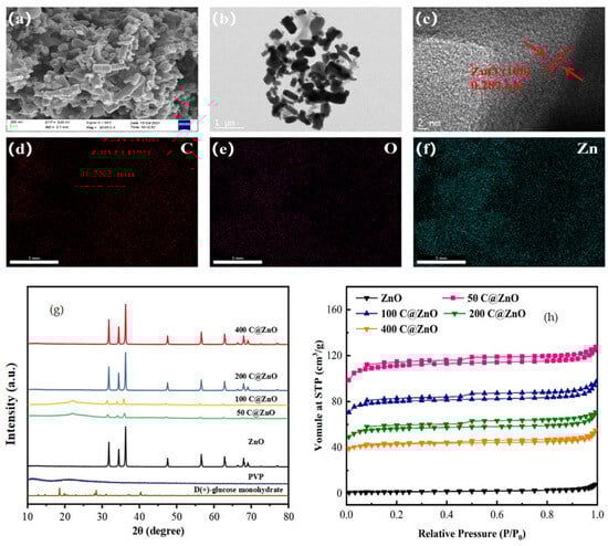 Characterization of C@ZnO (a) SEM, (b,c) TEM, (e) HRTEM, and (d–f) EDS images, (g) XRD pattern of C@ZnO, and (h) the N2 adsorption–desorption isotherm of ZnO and C@ZnO.