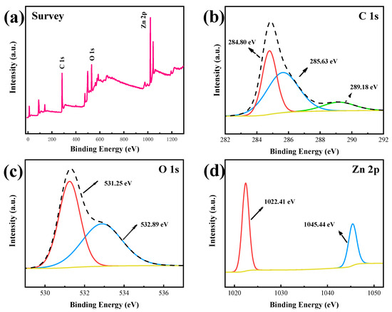 The elemental composition of the material sample 200 C@ZnO was characterized by XPS, and the results are shown in Figure 2. As shown in Figure 2a, the 200 C@ZnO sample revealed the presence of Zn, O, and C as major elements. The high-resolution C 1s spectrum (Figure 2b) showed peaks at 284.80 eV (C-C), 285.63 eV (C-O), and 289.18 eV (O-C=O), indicating the formation of carbon bonds [29]. The O 1s spectrum (Figure 2c) exhibited peaks at 531.25 eV (Zn-O) and 532.89 eV (C-O), attributed to lattice oxygen in ZnO and surface hydroxyl/chemisorbed oxygen, respectively [30]. The high-resolution XPS spectrum of Zn 2p for the sample (Figure 2d) exhibited two characteristic peaks at 1022.4 eV (Zn 2p3/2) and 1045.4 eV (Zn 2p1/2), consistent with the binding energies of Zn-O bonds in ZnO. The ~23 eV separation between these peaks, arising from spin-orbit coupling, matched the characteristic Zn 2p doublet spacing reported in previous studies, confirming the presence of ZnO in its crystalline phase [31].