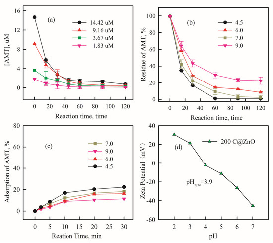 The impact of initial AMT concentration (a) and initial pH (b) on AMT removal in system after 120 min; the sorption properties of AMT change with the different pH values after 30 min (c); and Zeta potential of 200 C@ZnO material under various pH conditions (d). CNa2SO4 = 5 mM, current density = 20 mA/cm2, and CPS = 0.5 mM.